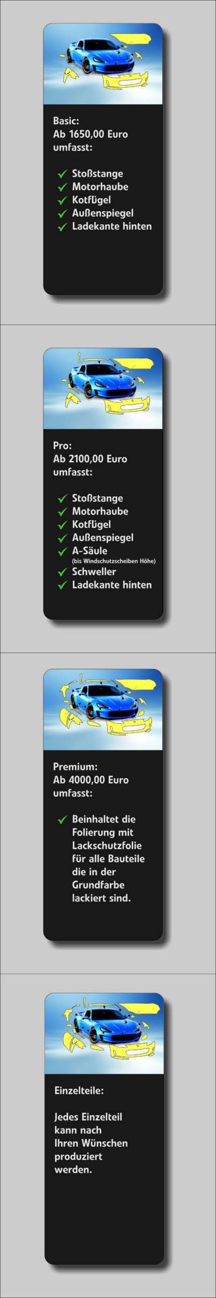 Transparente Schutzfolien können auch auf diesen empfindlichen Teilen aufgebracht werden, um sie vor Steinschlag oder UV-Strahlung zu schützen.